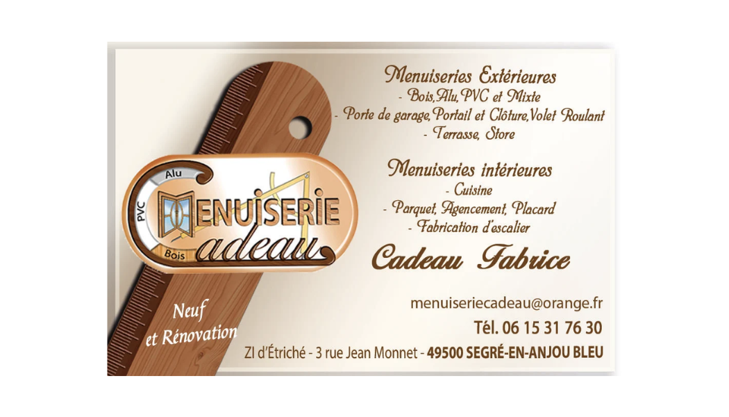 🏠 3 rue Jean Monet ZI d'étriché, 49500 Segré en Anjou Bleu 📞 06 15 31 76 30 ✉️ menuiseriecadeau@orange.fr